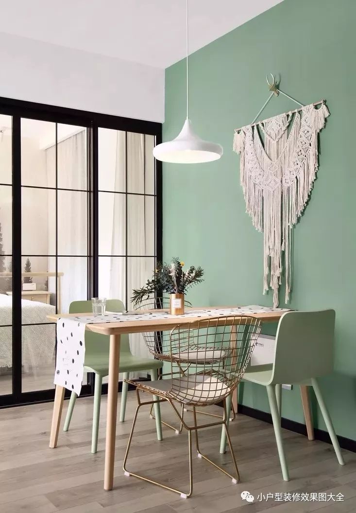 餐厅里抹茶绿色的背景墙,黑色边框的推拉门,深浅色系的碰撞,原木材质的餐桌椅和地板柔和了深浅色系碰撞的强烈色差感,清新简约。