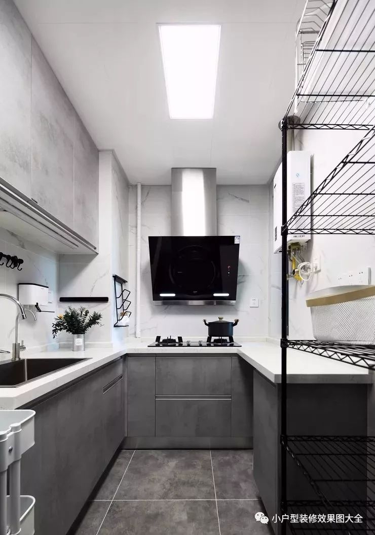 厨房的U型设计格局,灰白色搭配的主打色系,白色的大理石纹理灶台背景墙,灰色的上下双层橱柜和白色的石英石流离台面,还有门口两边各放置的收纳架,充分满足了收纳的需要。