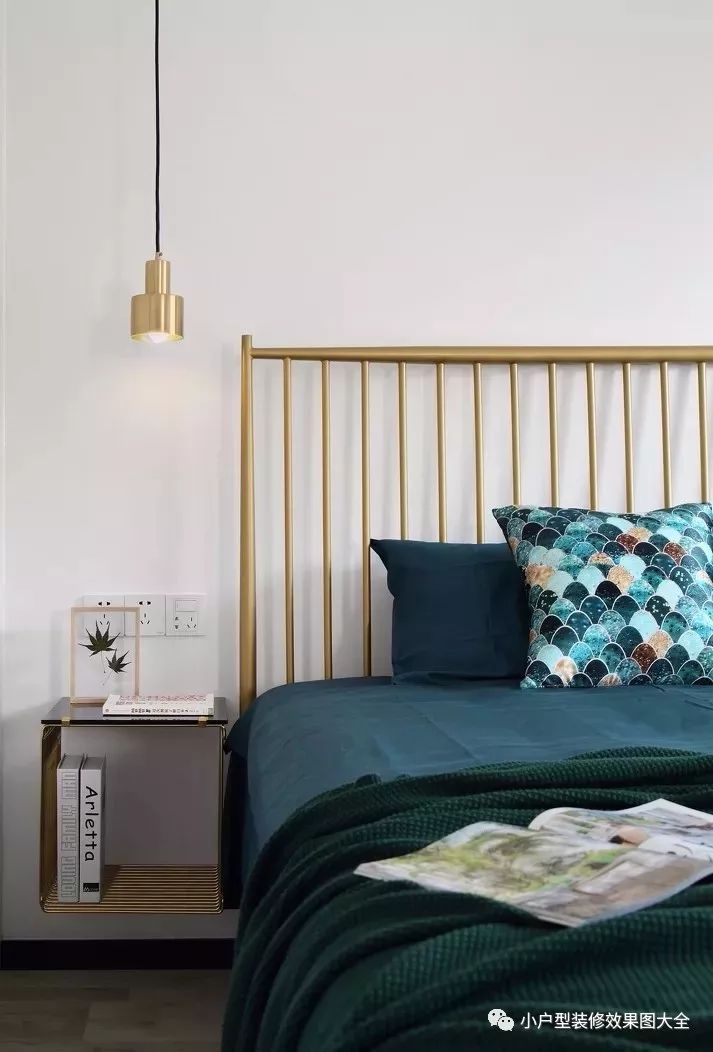 主卧用的是金色的金属制双人床,轻奢感的金色搭配简约样式的小家居,时尚质感十足。