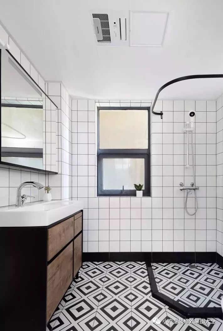 黑白色主打色系的卫生间,防滑花砖地板,干湿分离的设计,还有上方的排风口和空调口。