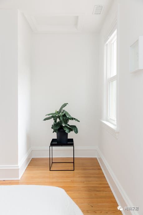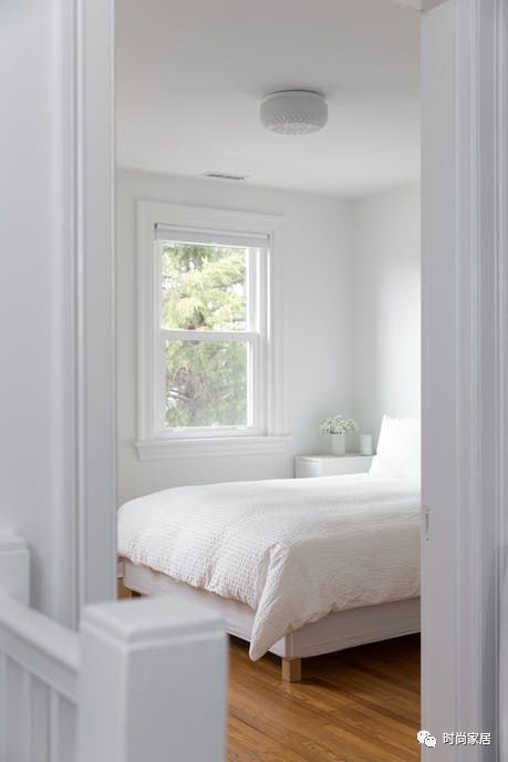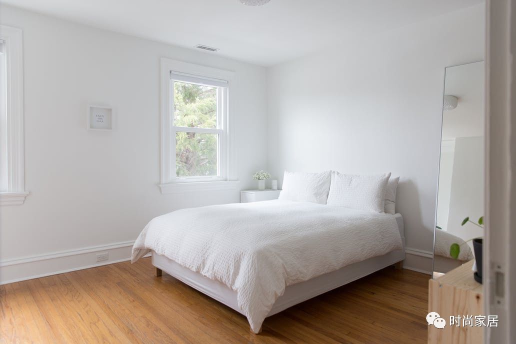 全白的卧室,搭配木色地板和家具,带来柔和暖意。
