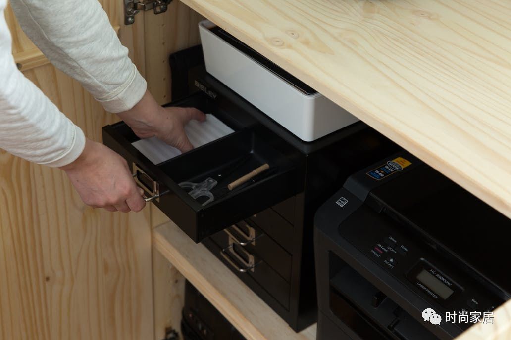 工作室的收纳柜里只有一点文具、一台打印、扫描设备和一只旅行箱。