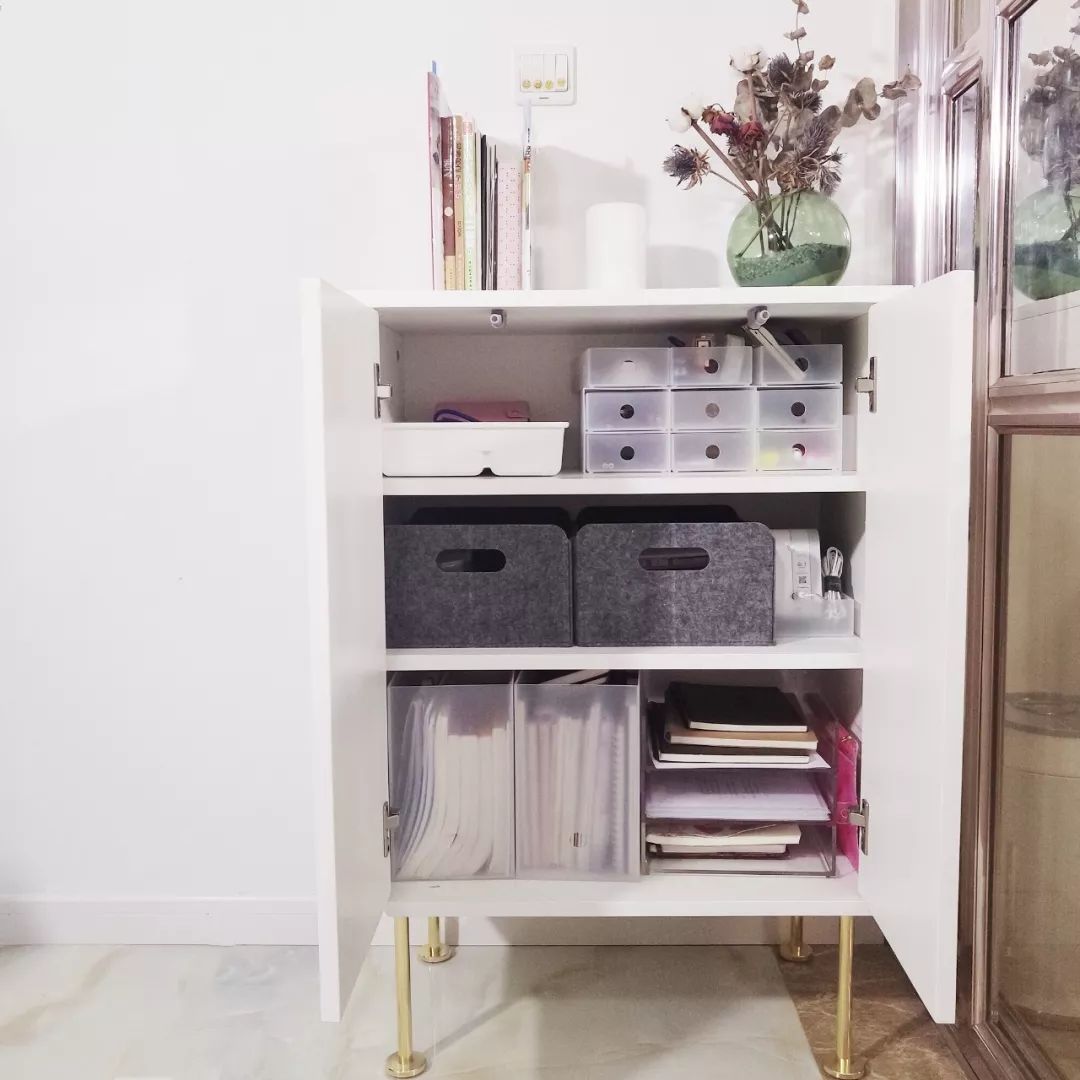 首先是这个白色金脚的收纳柜是在淘宝上定制的。简洁又有时髦感,当时一眼相中!