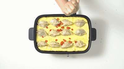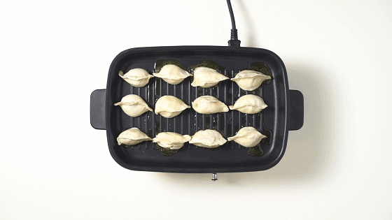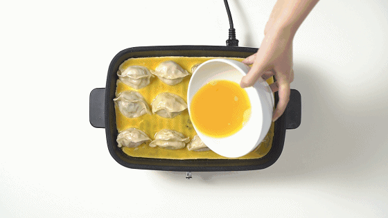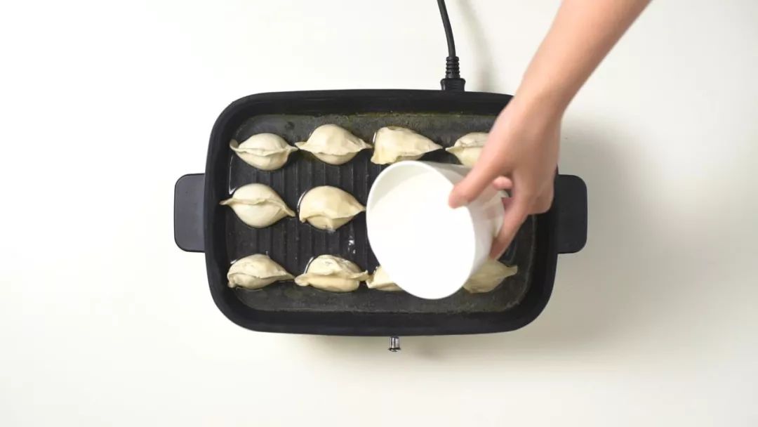 3 然后,端锅、插电、加热、放油,下饺子先煎到底部焦黄,大约1分钟。