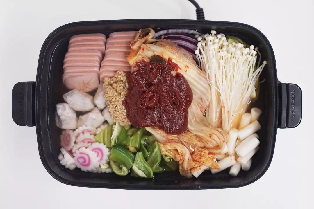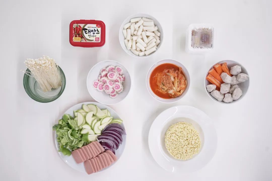 准备辛拉面,芝士年糕,金针菇,火腿片,蟹肉棒,芝士片,泡菜(研儿妹最爱),洋葱,西葫芦,青椒,鱼饼,韩式辣酱。(总之和焖锅一样都是很随意的,蔬菜和肉肉可以自行调节,主要的几样不少就行了~)