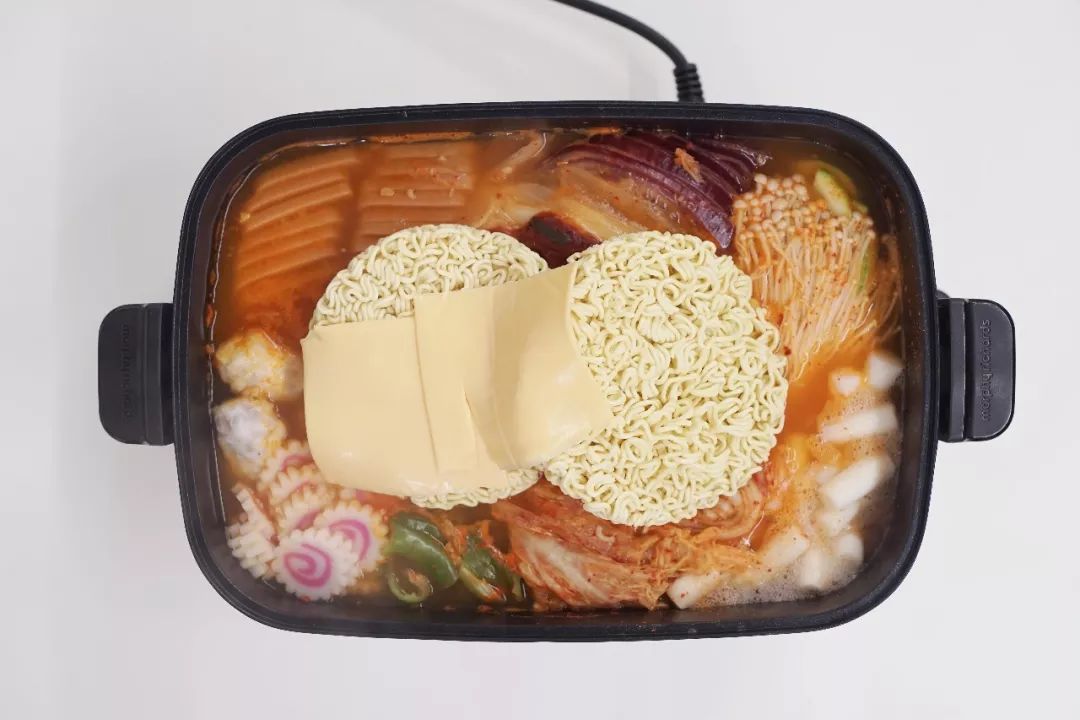 接着加水盖锅盖开大火。煮到咕嘟咕嘟丸子胖软了,就可以下辛拉面和芝士了,然后很快就可以开始享用美食了~