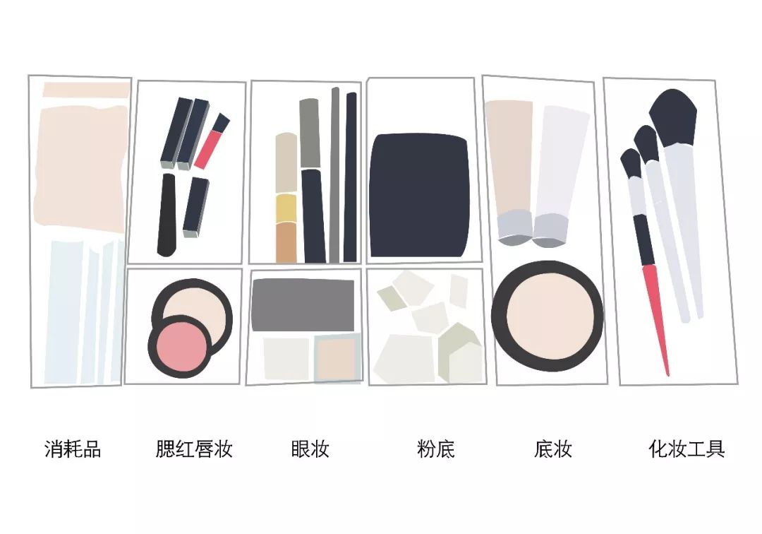 然后按照化妆顺序,上完底妆上粉底,再画眼妆和腮红,最后画口红。这样按照功能步骤一字排开后,化妆就变得轻松简单起来。