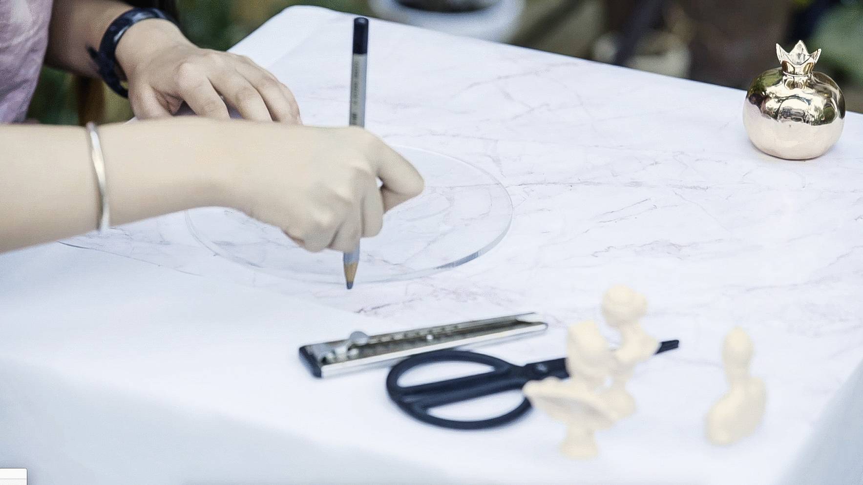1 按底盘大小在纸上画出形状,沿线剪下;