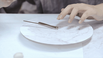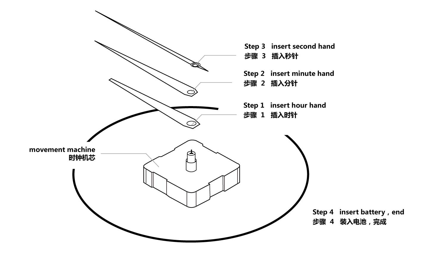 3 在表盘正中圆孔处划开十字小口,装上机芯,按顺序装上时针、分针、秒针,装上电池,拨到正确的时间,或者随便啥你喜欢的时间;