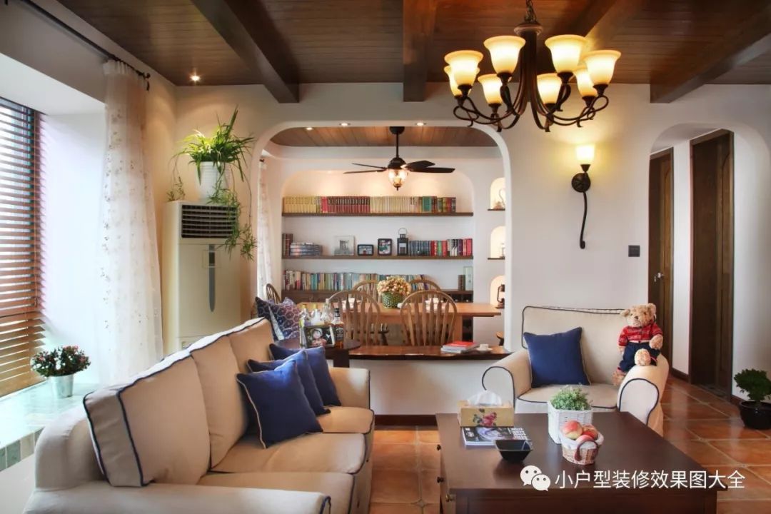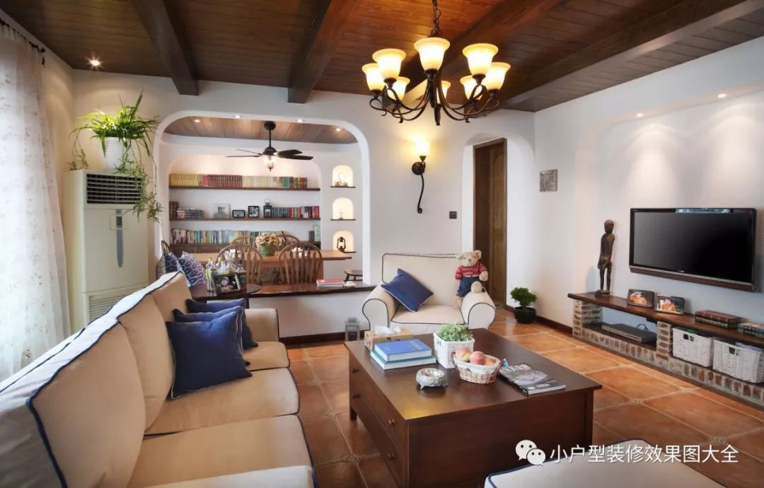 装修风格小测试,百分之八十的人都说喜欢这种风格!今天,小编要和大家分享的这个90平米的两居室小户型,是一个混搭有地中海风格和复古风格的房子,从整个房子的用色和格局的设计上,给人一种身处百年古宅的意境感。加下来,就和小编一起来看看吧,喜欢的朋友们可以参考一下哦!客厅的装修效果图整个客厅中用悬吊式木制