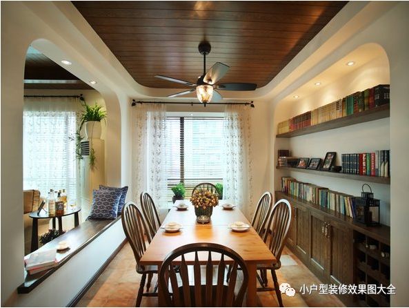 餐厅的吊顶是凹凸型和平面型结合的样式,中间是木材质的,上边搭配一盏风扇吊灯。旁边的内嵌式书架,让整个空间充满了书香氛围。