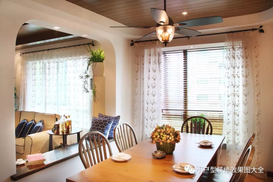 餐厅与客厅营造了一种似隔非隔的效果,中间一个拱门但是在下方有一矮墙将两者隔开,中间的小矮墙同时也是一个小长条坐凳。