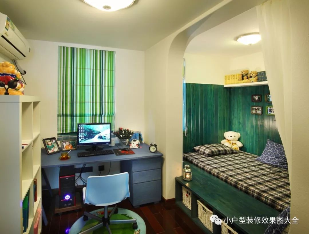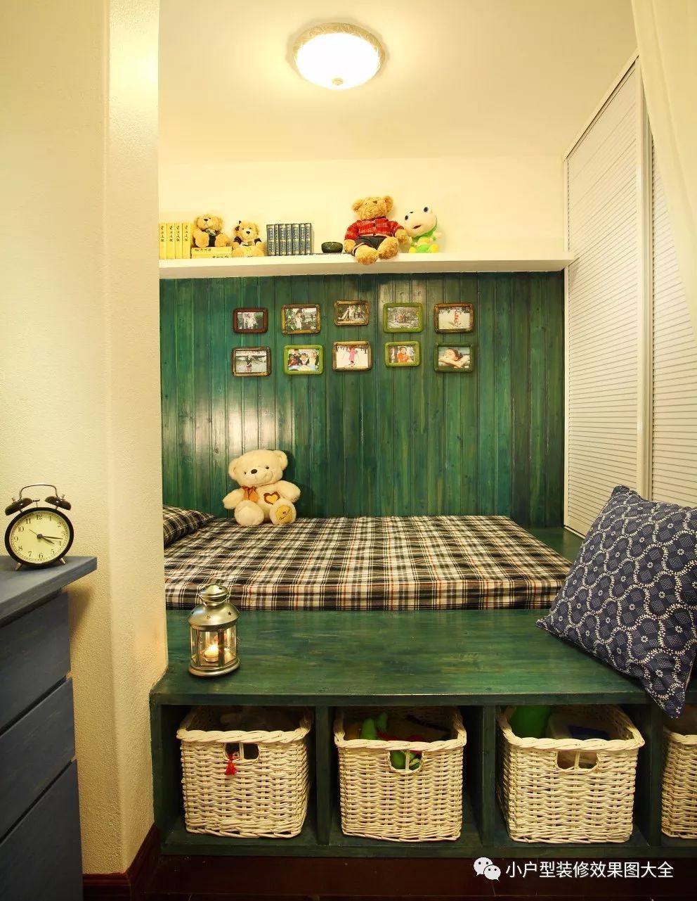绿色使整个儿童房的主打色,同样的拱门设计,榻榻米样式的儿童床,床边还有玩具收纳篮,很符合小孩子的趣味,随性也舒适。