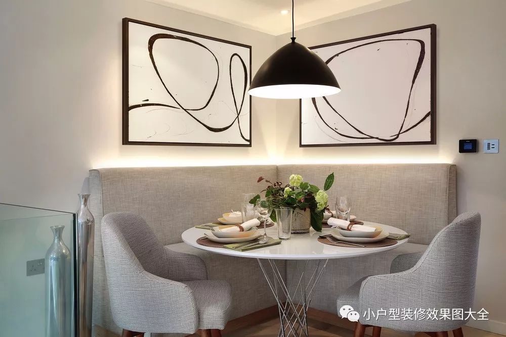 餐厅是卡座样式的,在楼梯的另一边,这样的设计增加了空间的宽度。