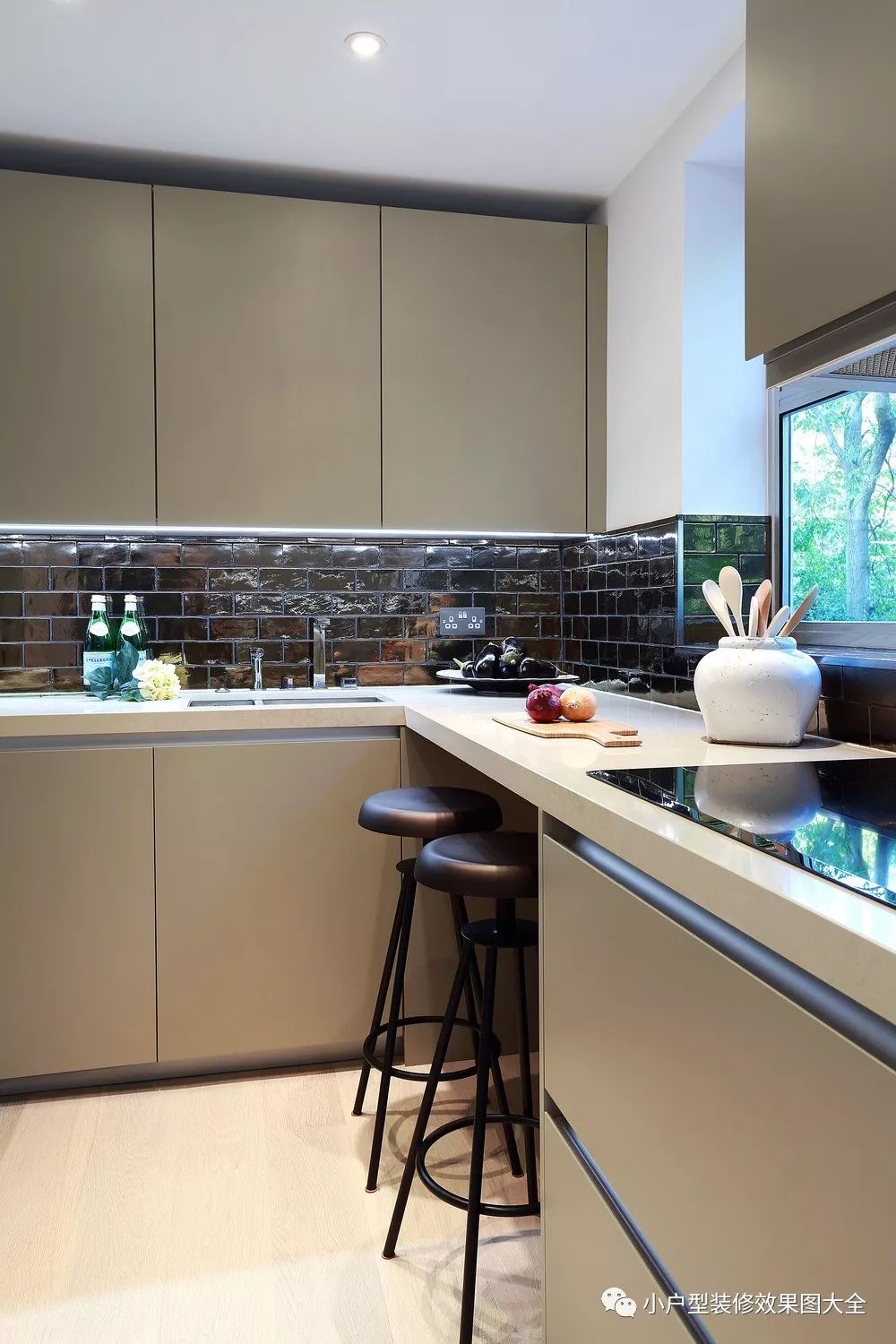 厨房采用的是美式风格,上下分明的隐形收纳柜,中间正好是厨房的各个功能分区,中间还有一个小小的吧台空间,下方搭配着两个深色的金属制高脚凳。