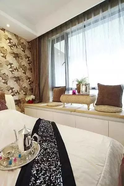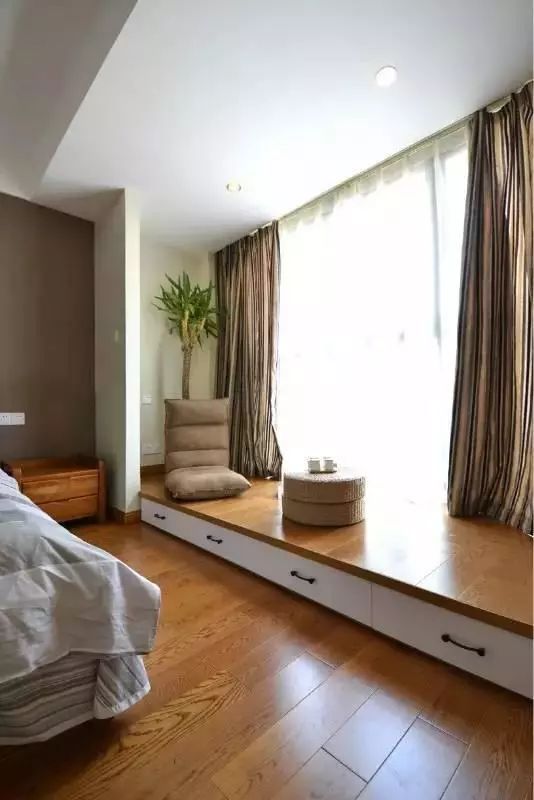 6 | 我相信卧室这种款式的装修大家也经常可以在各个地方见到了,不必多说,造个落地窗不如顺势将它打造成休闲飘窗区域,盘腿品茶别有一番风味,可以买些奇奇怪怪的家具了(?)。