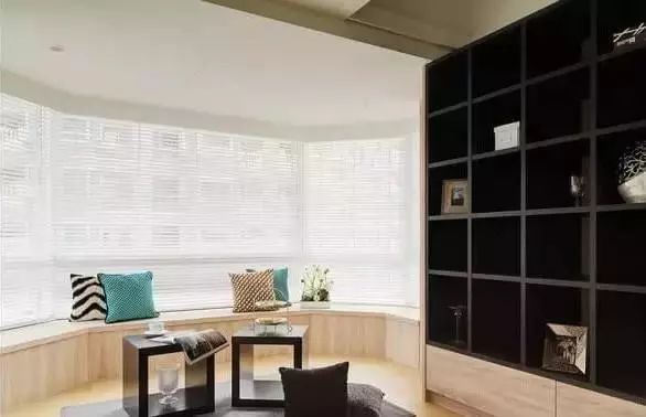 9 | 气质内敛任性横板霸屏飘窗登场。浅白百叶窗也能优雅,与黑色收纳展示柜碰撞,经典色感觉再现。这个空间设计比较现代化,家具挑设计感强的比较多,也走简约风,因此飘窗也没有太多别的设计,主打宽敞采光好就好。