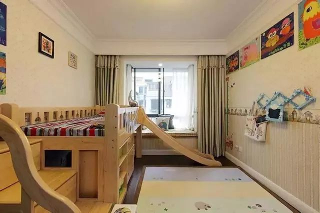 8 | 儿童房小飘窗,解放室内一定的空间,将台桌的功能挪到窗户边。这家人还造了个滑梯床,很有趣。注意做好防护措施哦!而且这个房间的设计适合大一点的孩子。