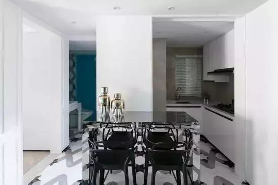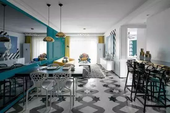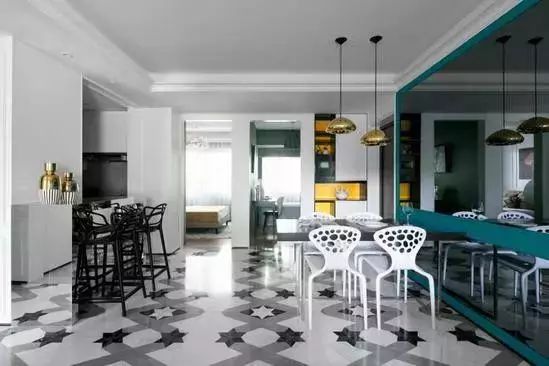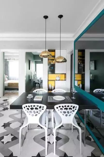 空间层次感爆棚的镜面、几何元素地板碰撞看起来既简单自然又透着一股精致文艺范儿;开放式餐厅和水吧、厨房联结,小户型空间一点都没浪费。