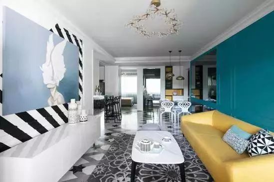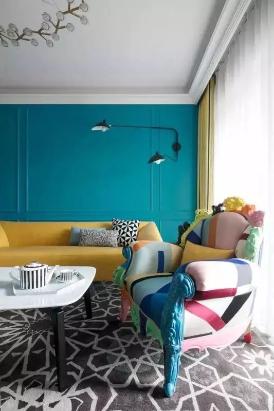 客厅,以大面蓝绿烤漆线板为主体,视线落点处缤纷色沙发,鲜明的家居颜色,彰显家居特色。