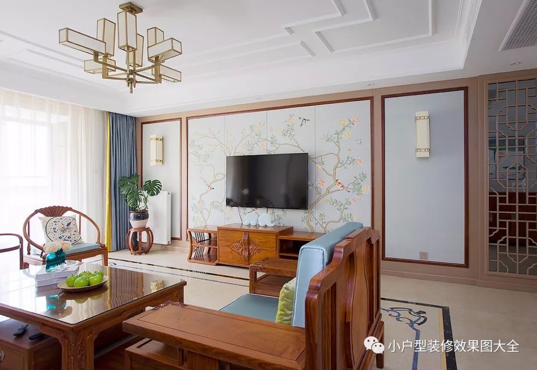 电视背景墙用了一点浅浅的蓝绿色底色,两侧成对称设计的中式壁灯,背景墙上的古画图案,带有中国传统文化的因素。