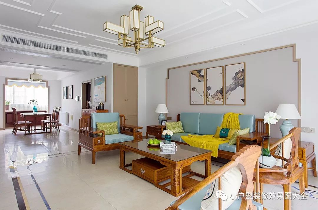 整个两居室用的是全铺的米色瓷地板,白色的石膏线条雕花的设计,很有古韵。客厅中摆放的是全套的新中式风格的沙发,搭配着天蓝色的坐垫和嫩黄色的抱枕,这样的色彩搭配不会让整个客厅显得过于端庄严肃。