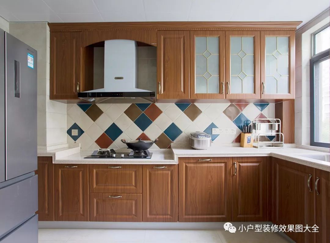 原木材质的上下双层设计的橱柜,带有经典的中式风格的韵味,中间的灶台背景墙用的是不同颜色的花砖,既耐脏比较容易打理,还能后调节中式家具带来的沉重感。