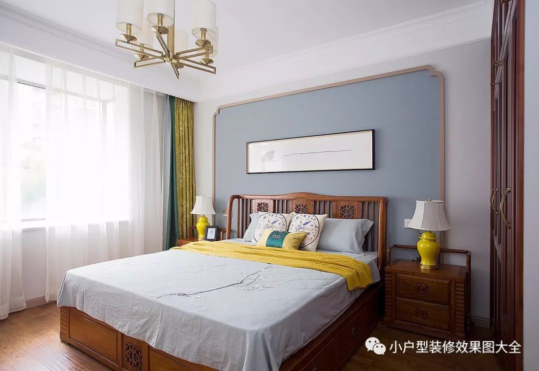 蓝灰色的背景墙,新中式风格的木制雕花双人床,蓝色和黄色拼搭的窗帘,增加了空间的活力。