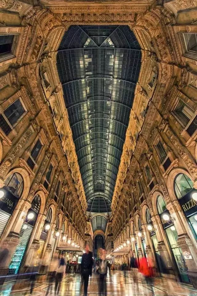埃马努埃莱二世长廊:意大利统一后第一位国王埃马努埃莱二世,这里被认为是欧洲最美的商业拱廊之一。两条交叉的长廊呈十字型,南北长198米,东西长105米,两条玻璃拱顶的走廊交汇于中部的八角形空间,上方是一个玻璃圆顶。阳光透过玻璃屋顶,照射在底下精致的浮雕和壁画上,泛着神圣的金色光芒。
