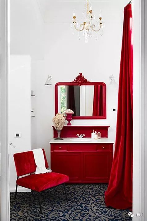 除了墙面,窗帘同样也是相对大面积的运用,天鹅绒的红色窗帘会给你家一种复古的高级气质,摩登又性感。