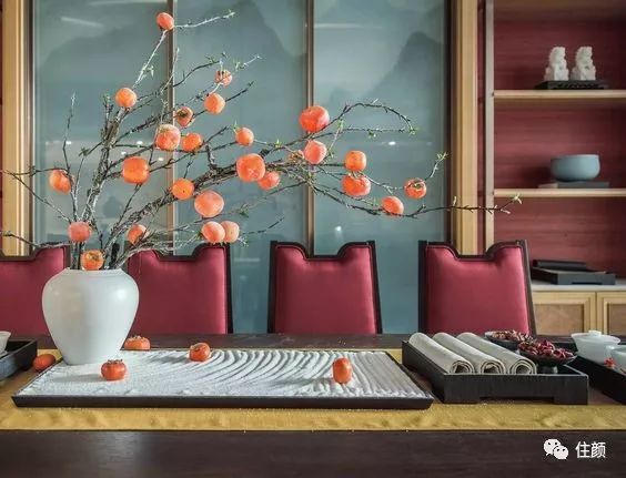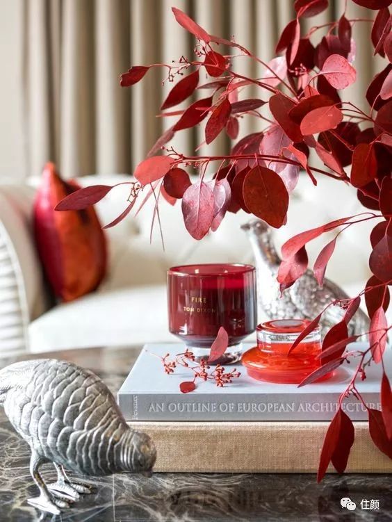 家里常摆植物或是鲜花的颜友们,可以把书房或是茶几上的植物换个颜色,默默地就能渲染一层节日感,没那么浓重却又很点睛,搭配个中式花瓶,不多不少,正适合不喜欢大面积红的家庭。