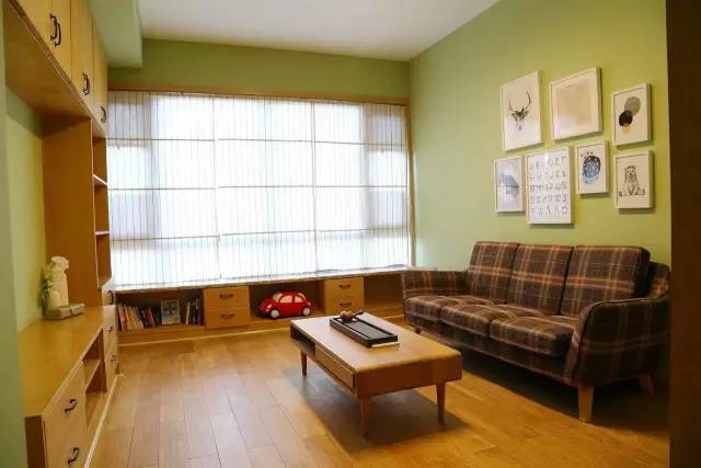 格纹的布艺沙发搭配莴笋色的乳胶漆,稳重而清新。半开放式的飘窗柜,慢慢会被女主人的书籍所填满。