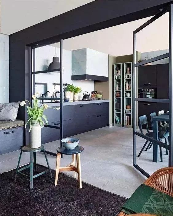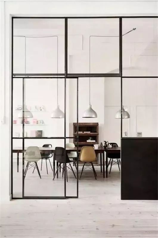 随着设计不断创新,隔断越来越多的用于装饰作用,尺寸可根据空间尺度进行适应性设计,打破传统玻璃隔断的局限性,让隔断越来越趋于时尚,特别是黑框玻璃隔断,与高级灰搭配,简直是天作之合。