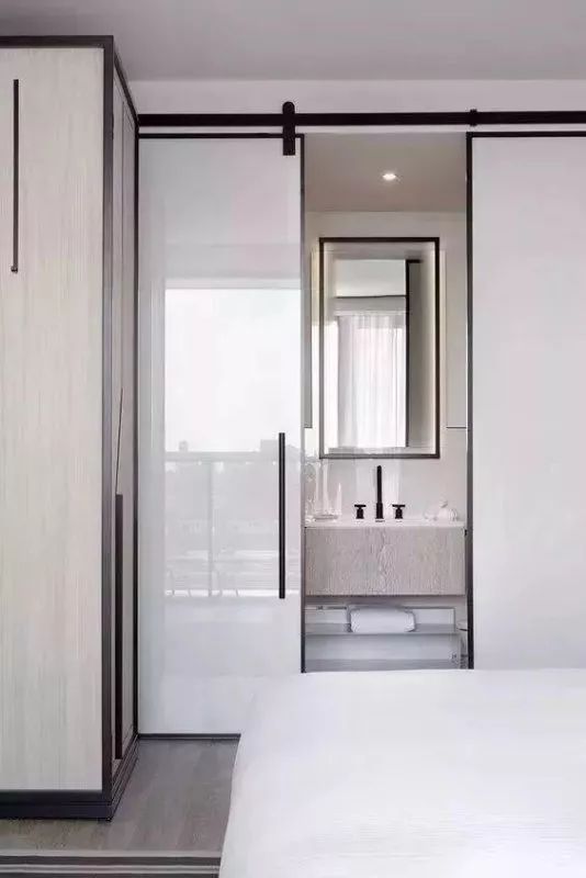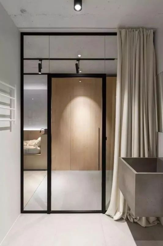 ▼可以认定为黑框推拉门,它却没有门把手,更没有门锁或者锁扣,完全出于对效果的把控,简练利索。