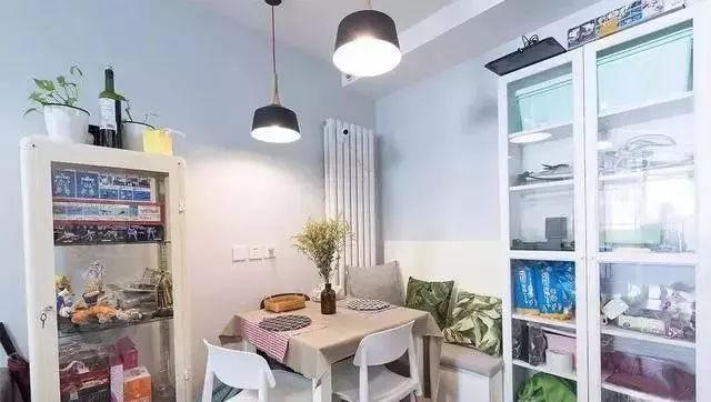角落里的小卡座餐厅,下面也可以储物。玻璃柜门看起来有些凌乱,但成品柜子方便置换,不担心审美疲劳的问题。