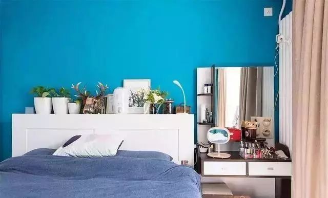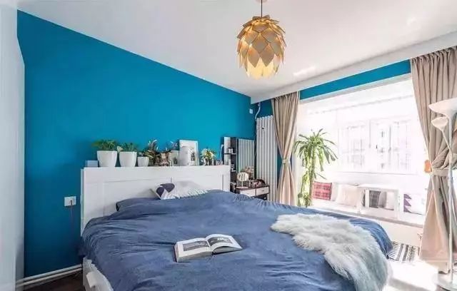 主卧蓝色的墙面,搭配白色的家具,整个空间更加生动有质感。