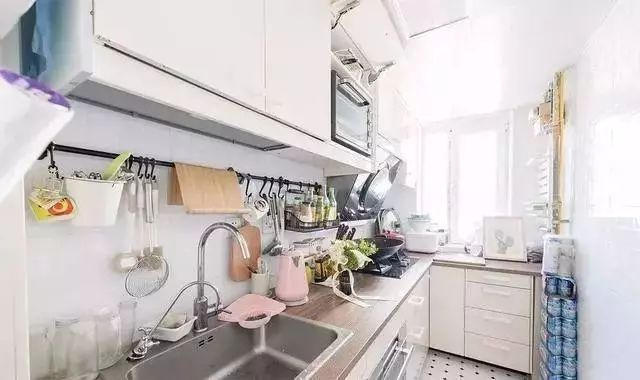 L型的小厨房没有浪费一点空间,即使墙面都装上了挂杆,节省台面空间,又方便拿取。橱柜尽可能的做了抽屉,用起来更方便。
