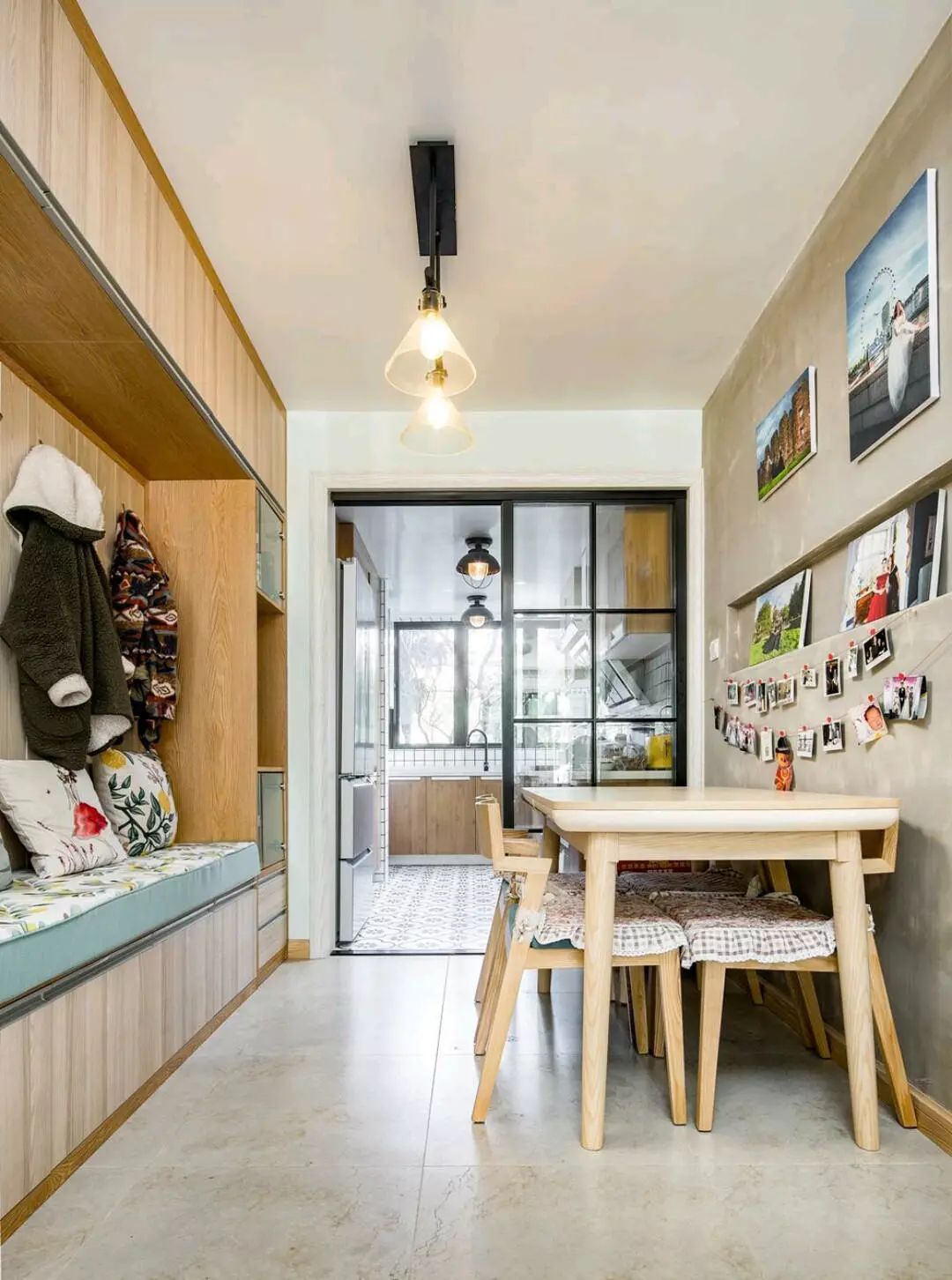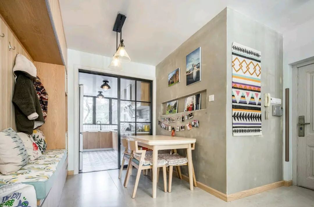 餐厅一面墙做了榻榻米玄关,另一面灰绿色水泥墙用做记录生活的照片墙