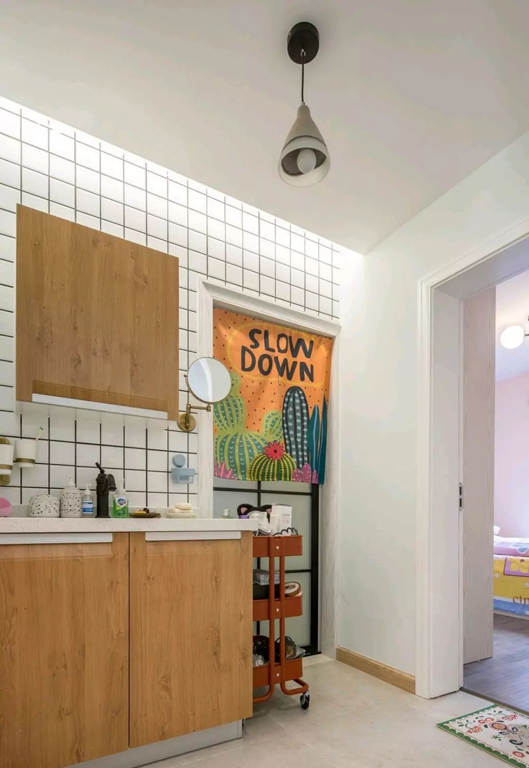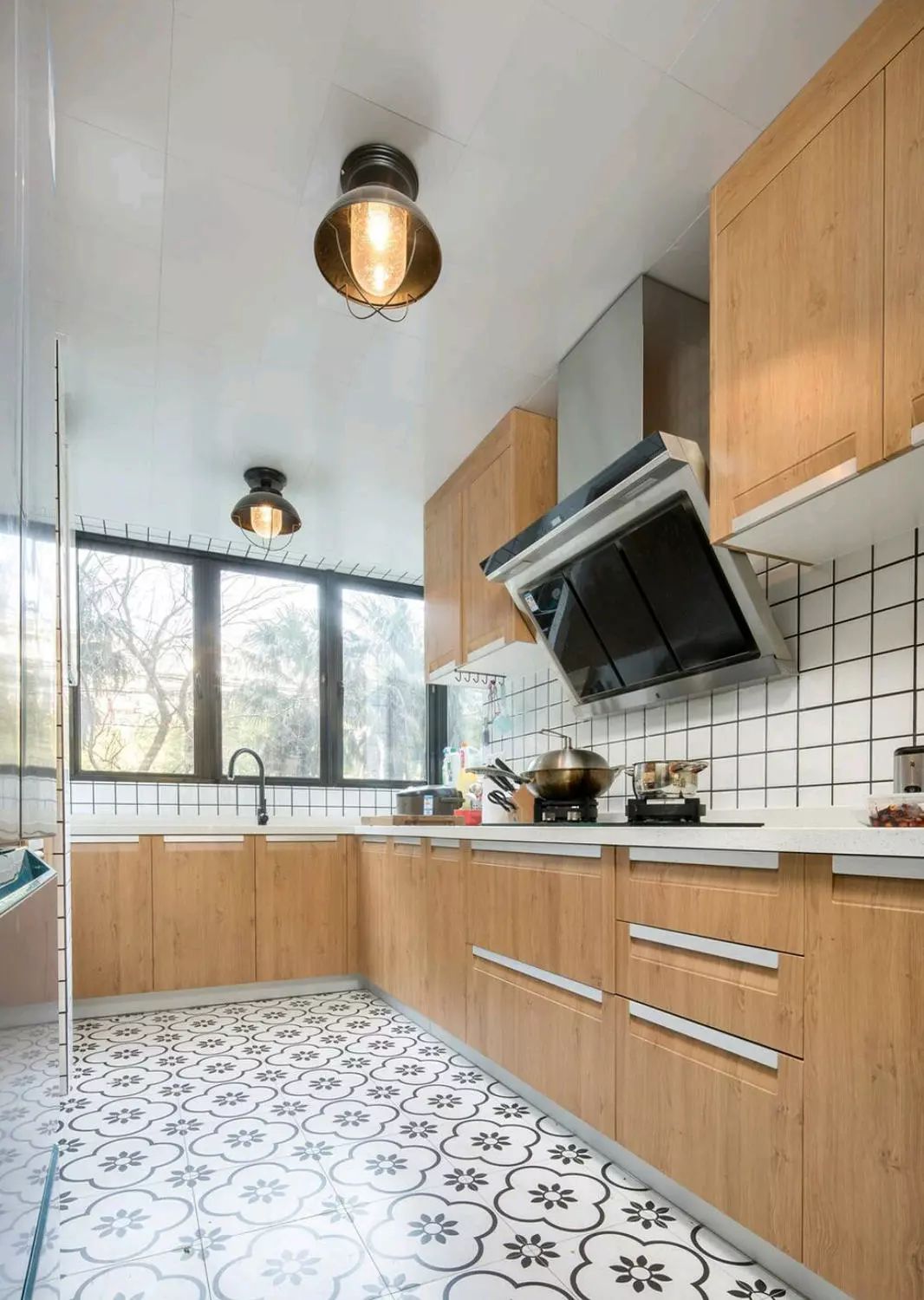 北欧带花的地砖,网格墙砖,厨房显得那么干净明亮