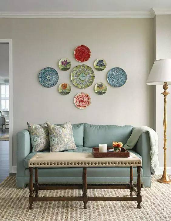 关注微信公众号:jiaxhx,学习更多小户型装修知识技巧家居装饰挂盘、摆盘、装饰盘,利用陶瓷的的工艺,手绘的装饰。一个个不起眼的小小盘子,通过手工工艺制作,挂在墙上或者摆在橱窗、玄关台上,都是一道美丽的风景。【现代风格】具有百变面孔的盘子可以做各种不同风格的墙面装饰,并现代的留下元素。瓷盘不仅可以