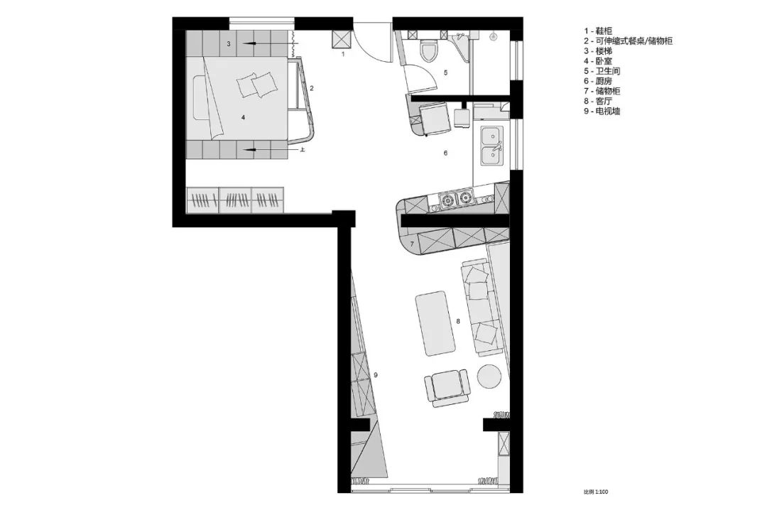 由于户型较小,储物显得尤为重要,因此储藏区占据了最大的体量,且穿插在其它功能体块中。隐藏式、推拉式、展示式,样式百变。加之开放式的厨房、可折叠的餐桌,还有隐藏式的洗手间,最大限度地利用每一寸空间。
