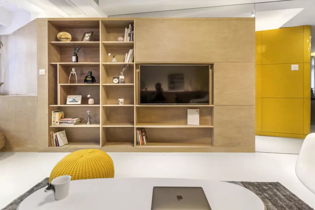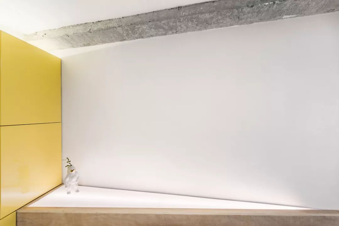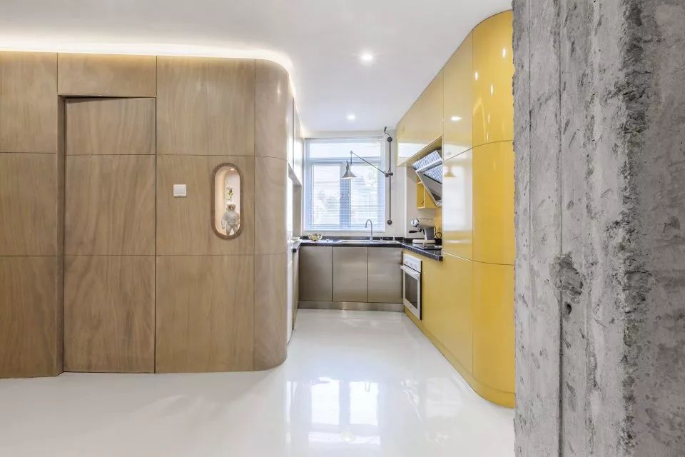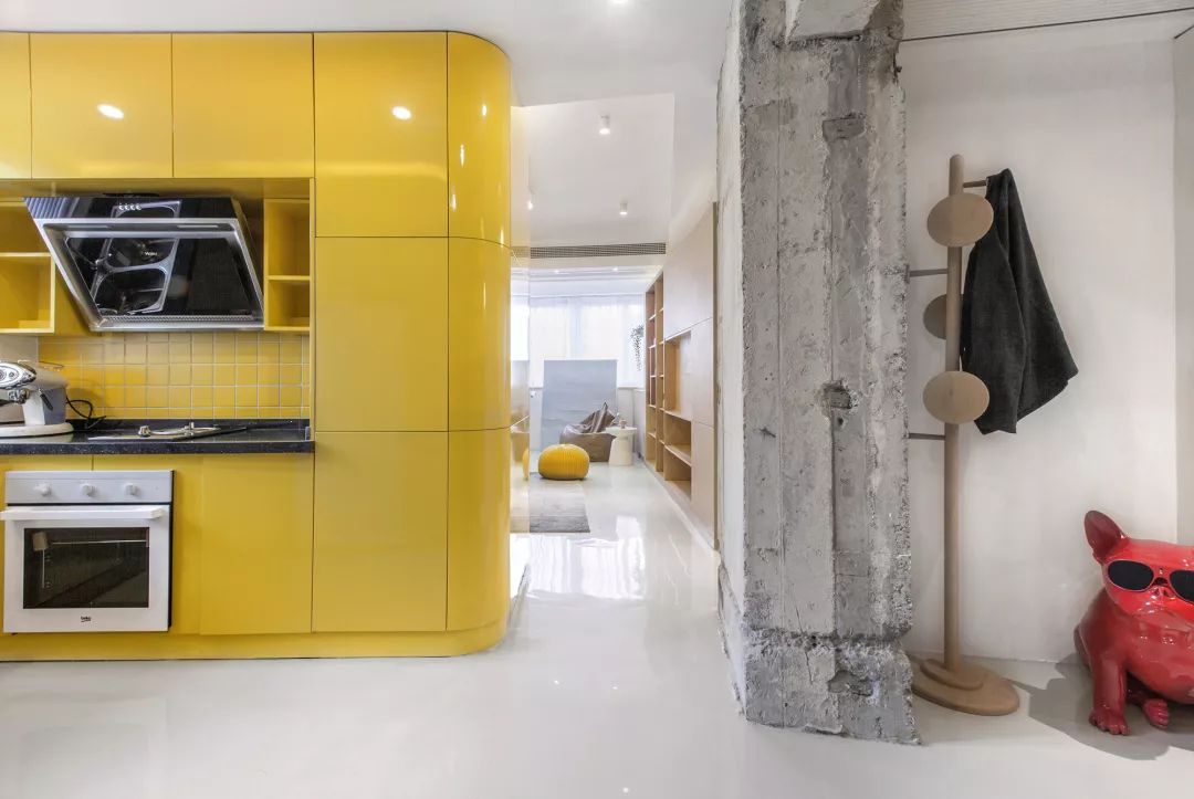 黄色的厨房柜体成为整个流动空间的中心,这样的改变让公寓完全消除了原本的压抑感,扩大了空间感受。