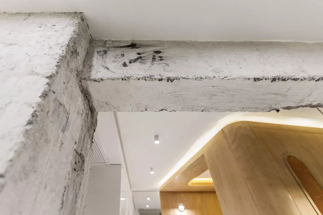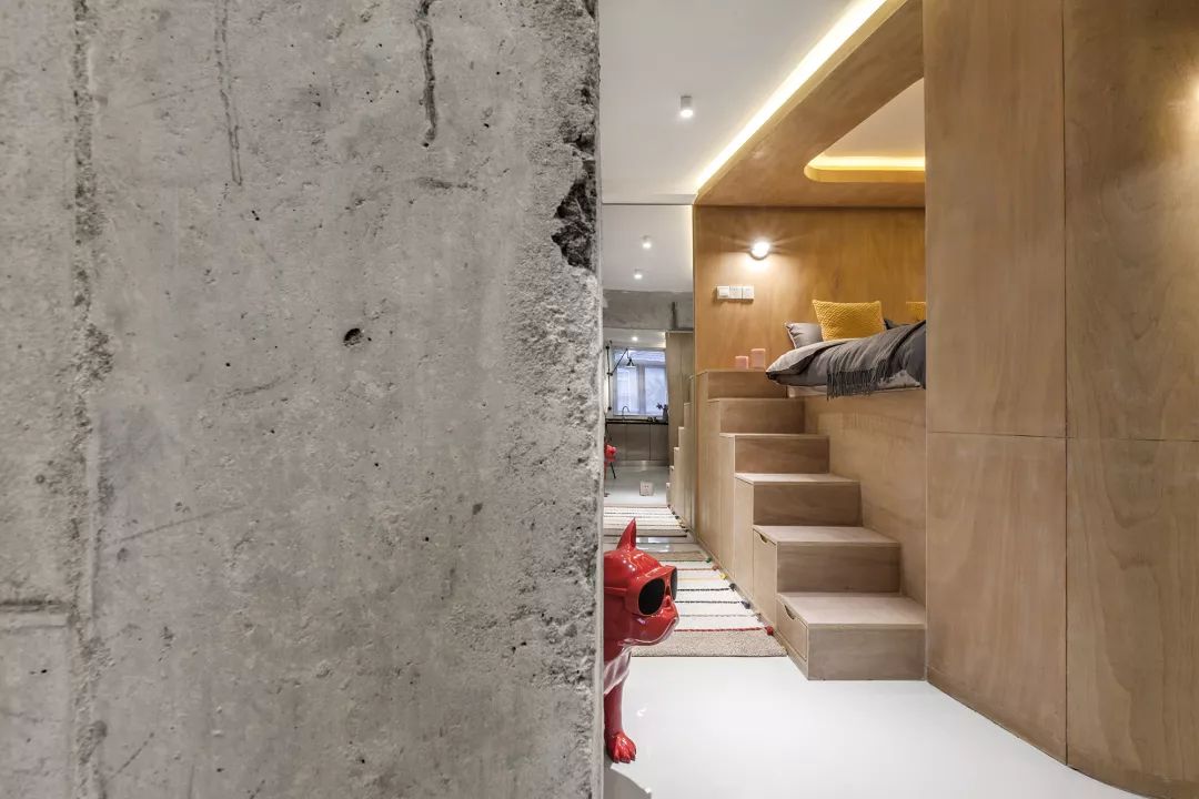 空间中还保留了部分梁柱及墙面,直接裸露着呈现出建筑的本体轮廓。同时,这些梁柱体系被强调后,也正好与10度的旋转互为参照,更显趣味。在尊重空间本质的基础上,设计师以富有创意和实用意义的设计手法,让这个空间犹如被施了魔法般,越住越大。