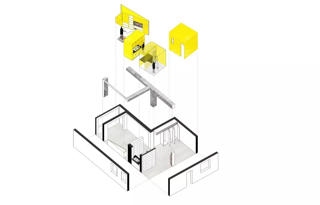 功能盒与功能盒之间构成新的活动区域。公寓从一个由一间间房子组成的常规形态变成一个由盒子外连续空间组成的流动空间形态。
