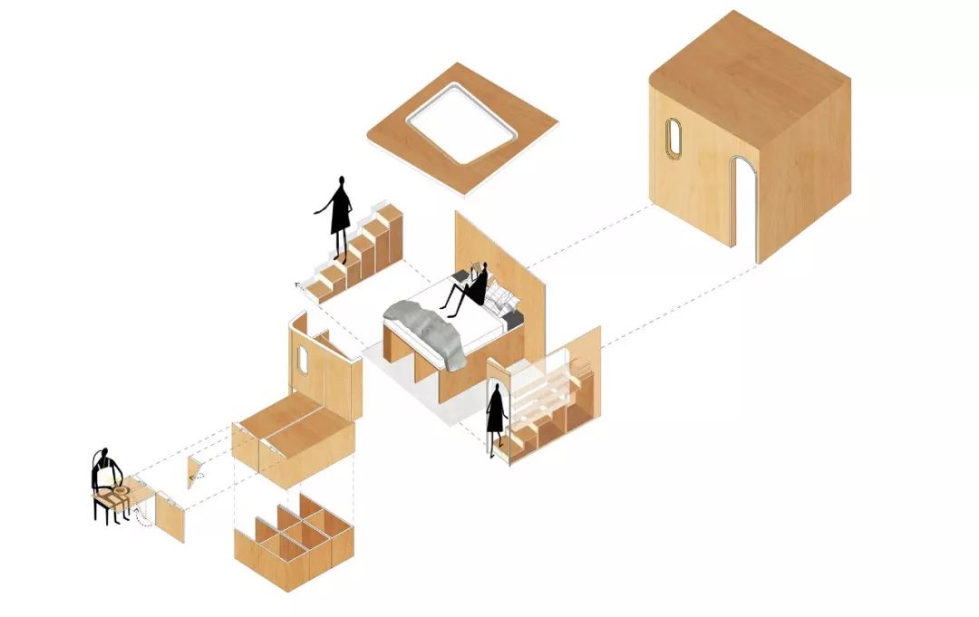 然而,这些被整合功能的体块置入小空间后会出现一些矛盾,特别是在娱乐功能体块置入后,整个空间的流线与视野都被遮挡。为此,设计师对原本的设计做出调整,将所有功能体块整体旋转10度后,功能块带来的阻挡问题迎刃而解。同时10度的倾斜也创造出一些有趣的夹角空间。在休息用的盒子旁边,该夹角空间正好容下上床楼梯,楼梯内暗藏收纳柜,灵活又实用。客厅的夹角空间变成三角形造型灯箱,成为客厅的氛围照明灯。