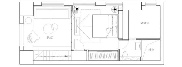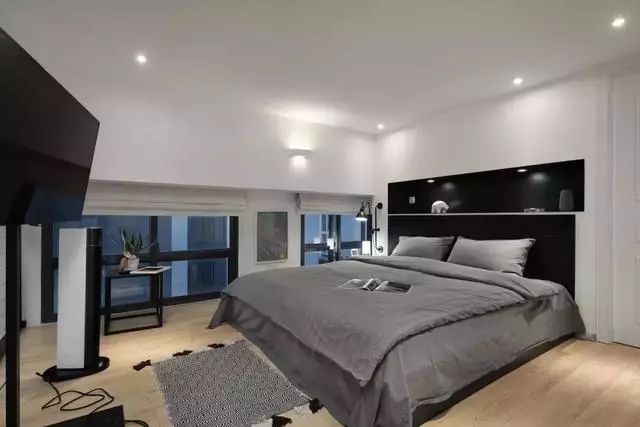 二层一整层做了全开放式的卧室,整个空间特别宽阔。整个卧室采用白+黑+灰的色调,灰色的柔软大床搭配黑色的背景,再结合床头上的壁灯,简单又时尚。
