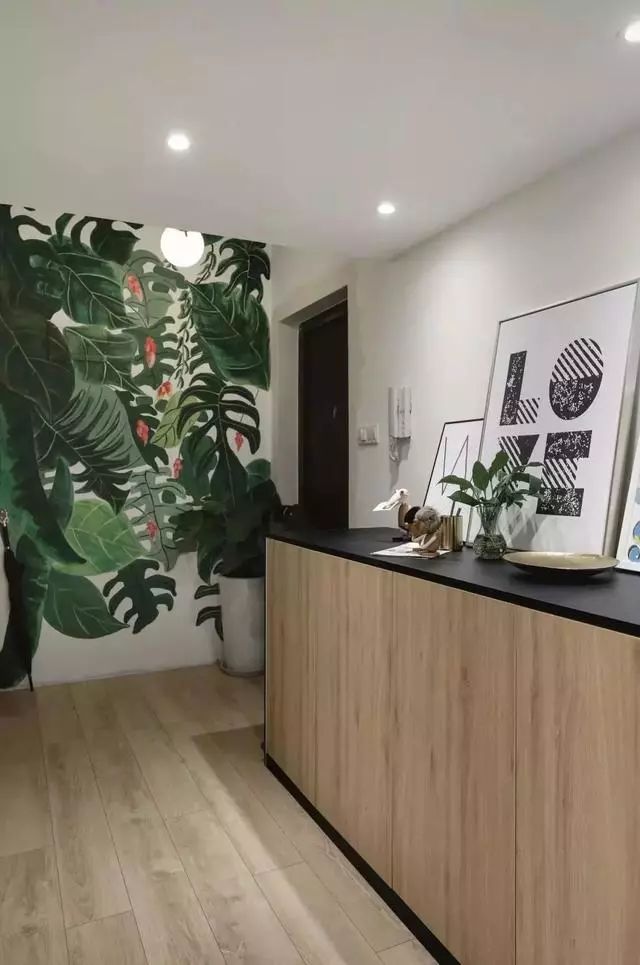 玄关做了挑空,进门即是满眼绿,整个空间清新,自然。左手边做了半墙鞋柜,上方可以随手放包包钥匙,也可以摆放各种装饰品。