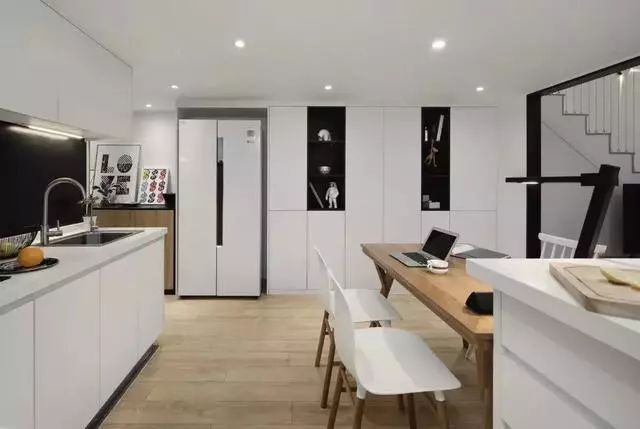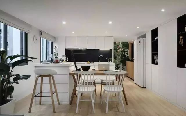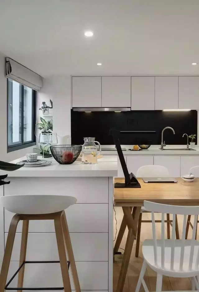 纯白色的橱柜、台面和吊柜之间,是黑色的墙面,白+黑的经典搭配,实用中易于清理。一张实木餐桌+一个吧台拼合,特别适合年轻人的品味。