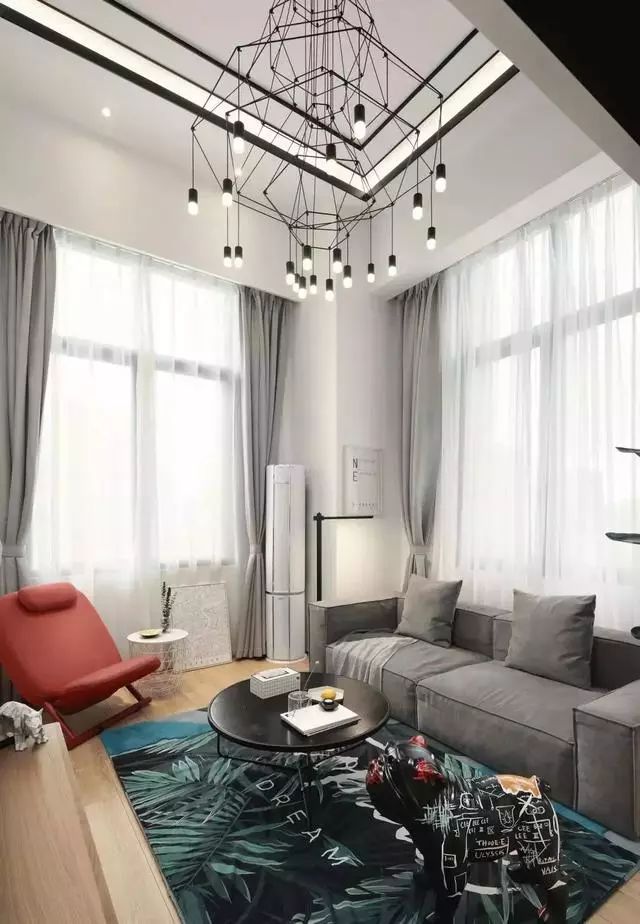 客厅基本保留了4米的挑高,顶面只做了简单的黑色线条勾勒。天花板上是一盏造型独特的蜘蛛网吊灯,是小白特意网购来放在客厅的。显眼的红色沙发在这黑白灰的空间里更显鲜活。
