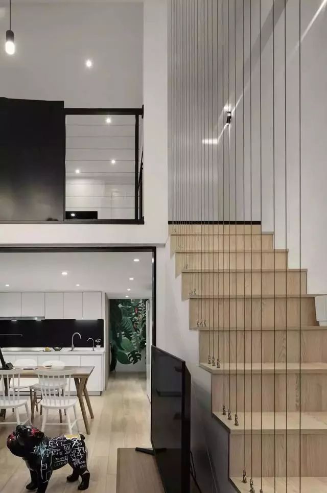 一层通往二层的楼梯边,用了铁丝吊筋细腻的线条+整齐的排布,不止美观还安全。